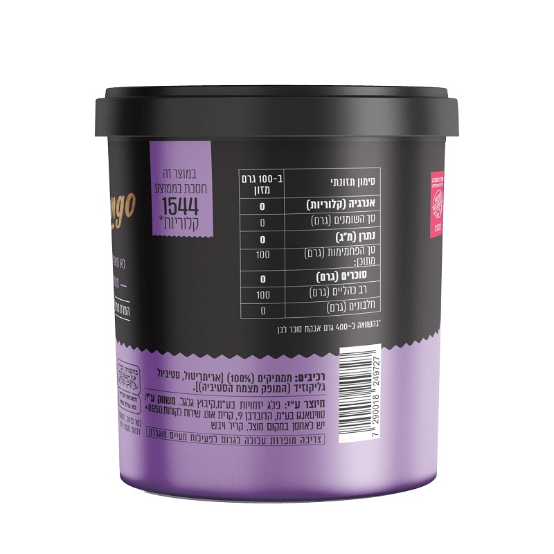 אבקת סוכר ללא סוכר, מתאימה לאפייה, קינוחים וקרמים. מכילה אריתריטול וגליקוזידים מצמח הסטיביה, המספקים מתיקות טבעית בלי להשפיע על רמת הסוכר בדם.