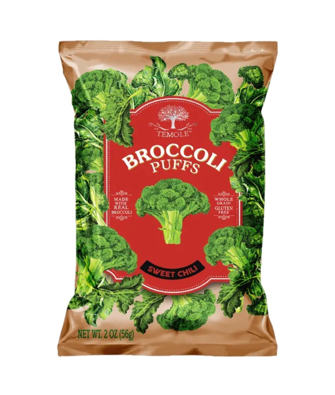 Temole Broccoli Puffs - חטיף ברוקולי פריך בטעם צ'ילי מתוק חטיף ברוקולי אפוי בתנור המשלב ברוקולי, אורז ושמן קמח אורז עם תבלינים טבעיים. מתכון מינימליסטי המעניק חטיף קליל, מזין וטעים, עם פיצוץ של צ'ילי מתוק ושום בכל ביס. פתרון קל ונגיש למי שרוצה לשלב ירקות בתפריט היומי בצורה טעימה.