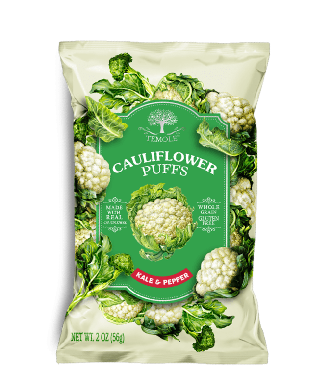 Temole cauliflower Puffs - חטיף כרובית אפוי בטעם קייל ופלפל שחור חטיף כרובית טבעוני ואפוי בתנור, המשלב כרובית, אורז חום ושמן סובין אורז עם אבקת קייל ופלפל שחור. חטיף קליל ומזין, ללא גלוטן, סויה, צבעי מאכל או חומרים משמרים – פתרון בריא ונוח לנשנוש יומיומי.