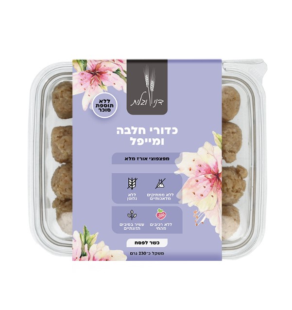 כדורי חלבה ומייפל המיוצרים מחומרי גלם טבעיים ללא תהליך אפייה. השילוב בין טחינה גולמית למייפל יוצר נשנוש המותאם לתזונה ללא גלוטן ולתזונה טבעונית, ומהווה פתרון לקינוח איכותי לימי החג ולכל ימות השנה.