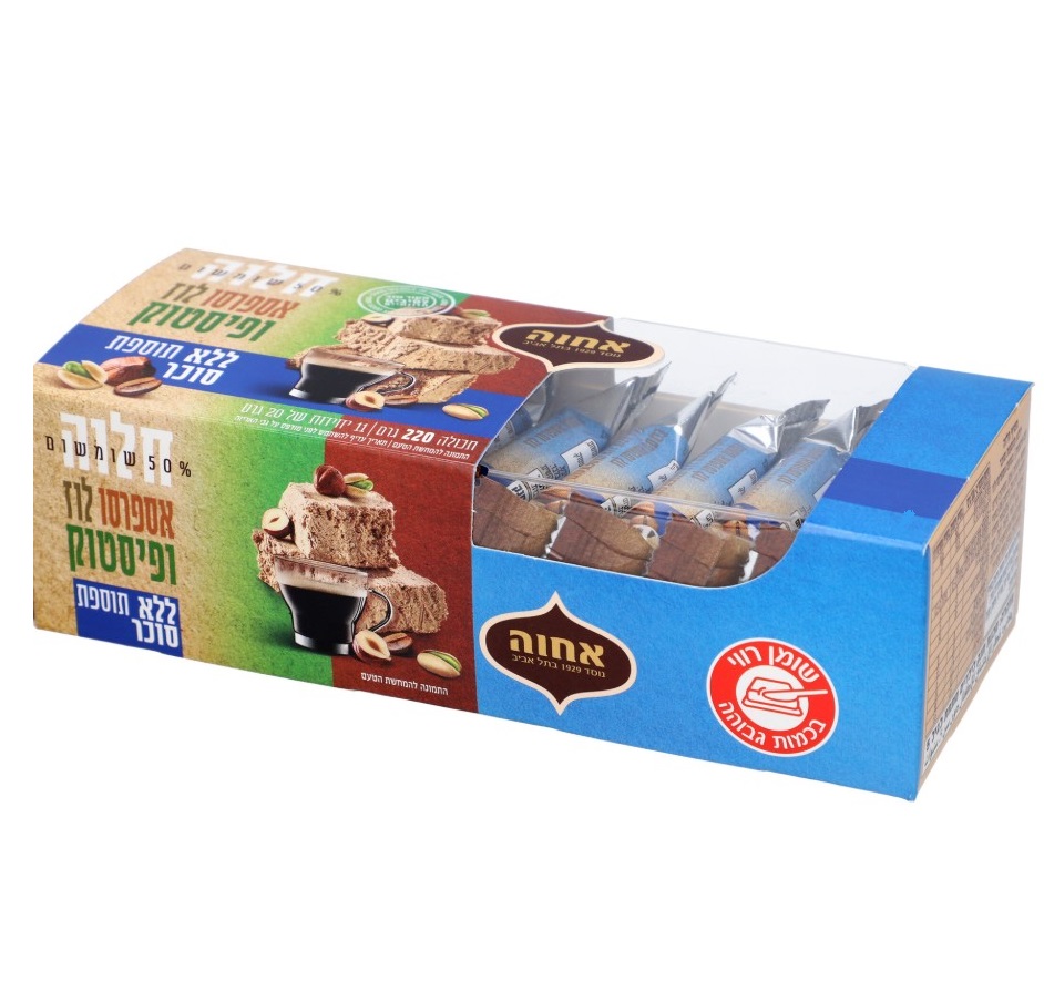 מארז חטיפי חלוה פריכים, טעימים ומזינים, ללא סוכר. משלב את הטעמים העשירים של אספרסו, לוז ופיסטוק בכל חטיף, ומתאים לנשנוש יומיומי או כחטיף מתוק לצד קפה או תה.
