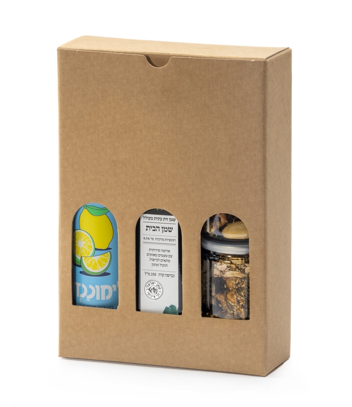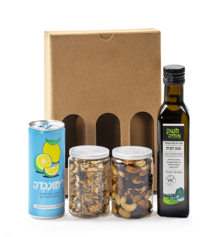 מארז מעוצב בתוך קופסת קרטון טבעית עם חלוניות הצצה, המעניקה מראה יוקרתי ומסודר. שילוב מדויק של מוצרי יסוד איכותיים לצד נשנושים בריאים, שמתאים מאוד כשי אלגנטי ומכובד.