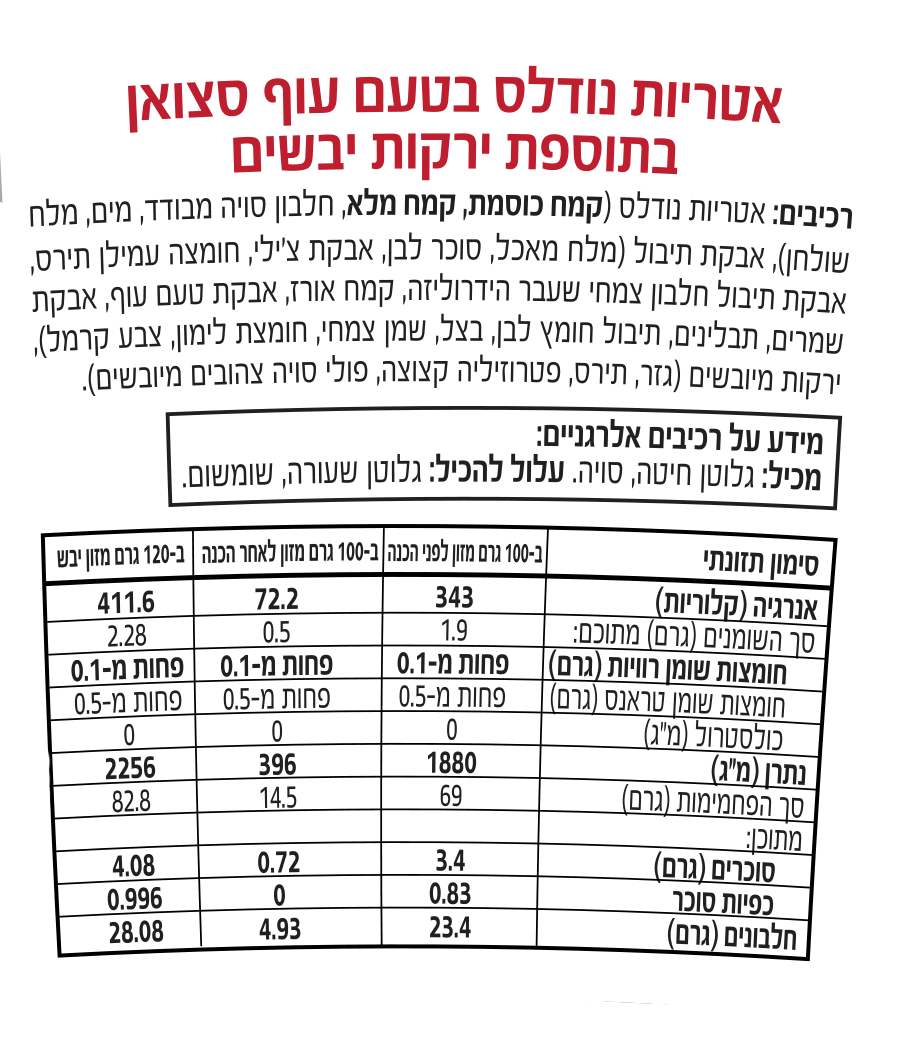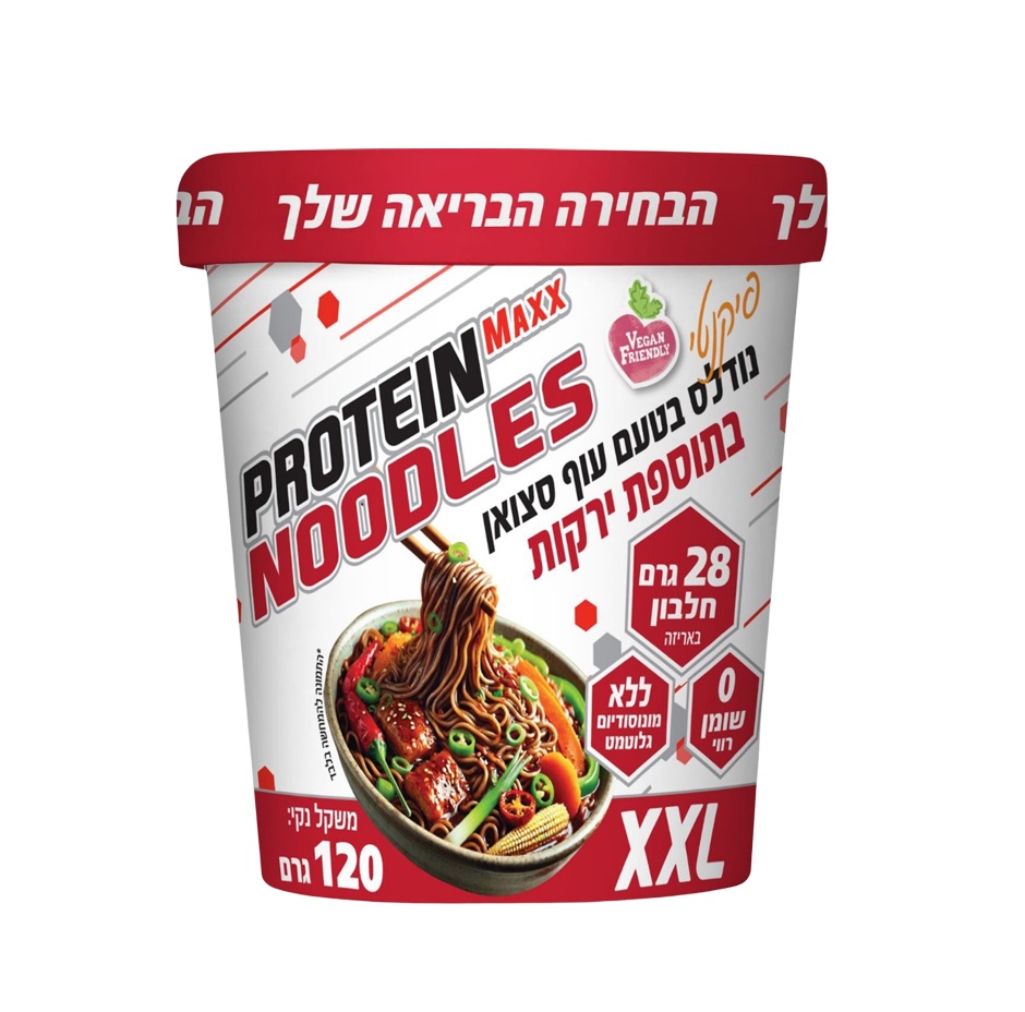 פרוטאין מקס נודלס בטעם עוף סצ'ואן בתוספת ירקות - ארוחה משביעה ומהירה המכילה 28 גרם חלבון בקופסה אחת. מוכנה תוך 5-7 דקות: הוסיפו מים חמים, המתינו ותיהנו מארוחה מפנקת.