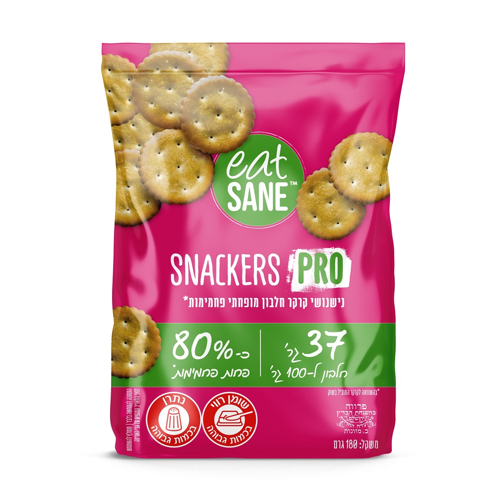 Snackers Pro - קרקר חלבון מופחתי פחמימות, 37 גרם חלבון ל־100 גרם, כ־80% פחות פחמימות וכ־86% פחות סוכרים. טבעוני, ללא ממתיקים מלאכותיים ועשיר בסיבים תזונתיים.