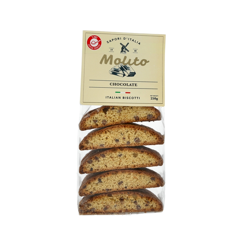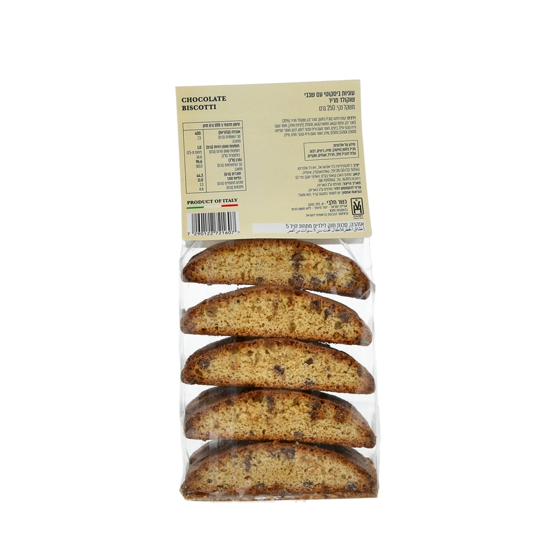 ביסקוטי איטלקי פריך עם שבבי שוקולד, עשוי לפי מתכון מסורתי מאיטליה. האפייה הכפולה יוצרת מרקם יבש וקראנצ’י, בעוד השוקולד האמיתי מוסיף טעם עמוק ומפנק בכל ביס. בחירה אידיאלית לליווי משקאות חמים או כפינוק אלגנטי.