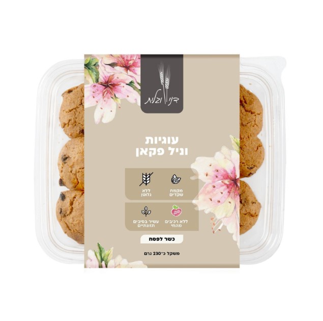 עוגיות נימוחות המשלבות קמח שקדים איכותי עם אגוזי פקאן ונגיעה של וניל אמיתי. העוגיות מותאמות לתזונה ללא גלוטן ומהוות פתרון לקינוח או נשנוש ללא מרכיבים מן החי, הן לימי החג והן לשימוש יומיומי.