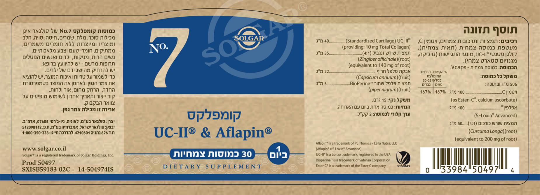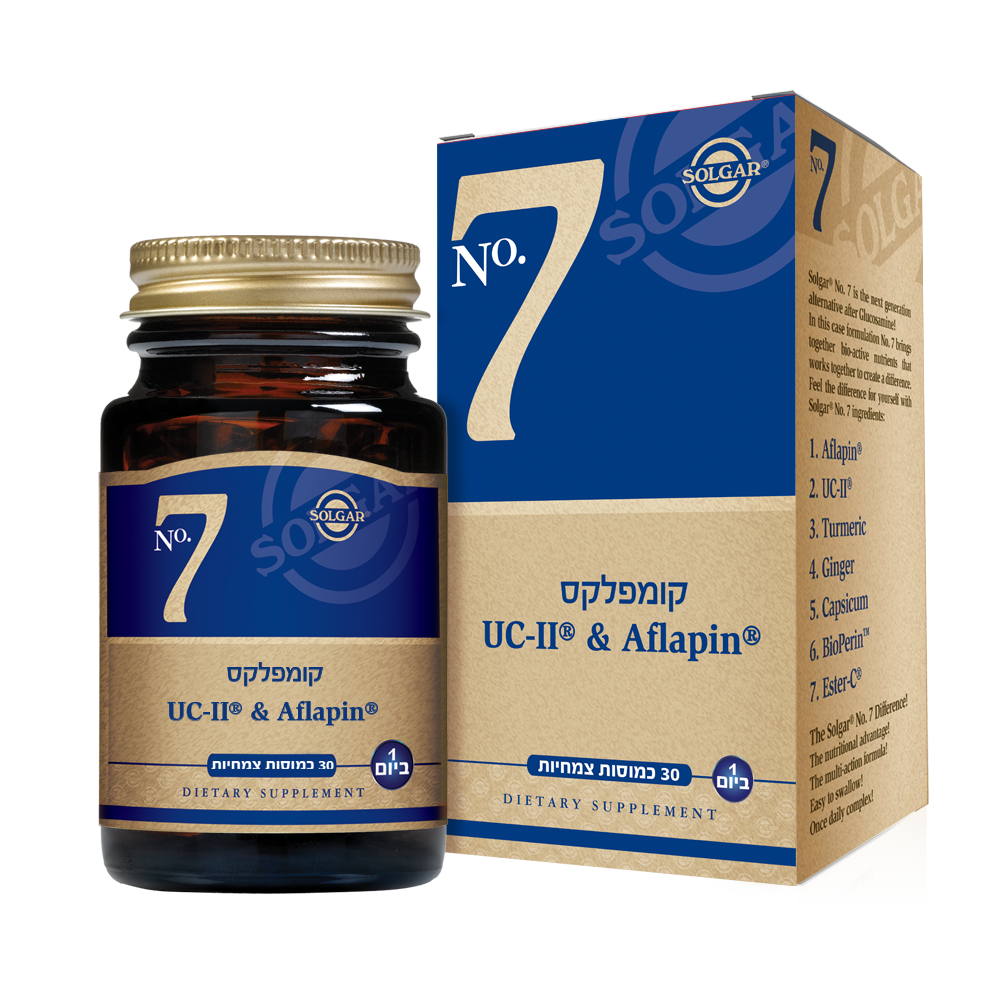 השיגו תנועה חלקה ונוחה יותר בעזרת No.7 מבית סולגאר, קומפלקס עוצמתי המשלב רכיבים שנבחרו בקפידה לשיפור הגמישות והתפקוד היומיומי. הפורמולה מתבססת על הטכנולוגיות המתקדמות ביותר, כולל הרכיבים הפטנטיים אפלפין® ו-UC-II®, המגובים בהצלחה בינלאומית ובהכרה מקצועית של רופאים ואורתופדים. לצד הפטנטים, המוצר מכיל קומפלקס צמחי הכולל כורכום ופיפרין לספיגה אופטימלית, המעניקים יחד תמיכה רחבה במערכת התנועה. השימוש ב-No.7 מסייע לצמצם מגבלות תנועה וליהנות מאורח חיים פעיל וחיוני יותר, כל זאת במוצר טבעי בכמוסות צמחיות איכותיות.