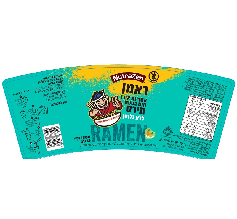 רכיבים: אטריות אורז ראמן 74.45% (אורז חום 50%, אורז לבן 37%, עמילן טפיוקה, עמילן תפוחי אדמה, גליצרול מונוסאטראט), שקיק אבקת תיבול 14.55% (מלח, מחזקי טעם מונוסודיום גלוטומט E621 ודיסודיום 5-ריבונוקלאוטידים, סוכר, חומרי טעם וריח, תמצית שמרים, סיליקון די אוקסיד, צבע מאכל קרמל), שקיק שמן תיבול 7.27% (שמן דקל), מארז קישוט 2.73% (גזר, תירס, עירית).