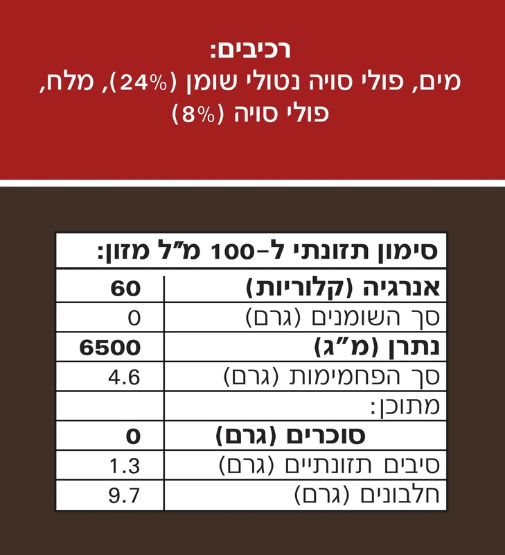 רוטב סויה סקיני פסטה מתאים להכנת מגוון מאכלים אסיאתיים ואחרים ללא גלוטן - לבישול, למרקים, לסלטים, למוקפצים וכמטבל לסושי. ללא תוספת סוכר, ללא גלוטן, ללא חומרים משמרים, ללא מונוסודיום גלוטומט, ללא שומן וללא כולסטרול. תכולה: 330 מ"ל