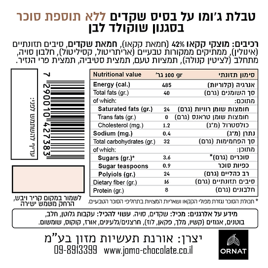 שוקולד לבן טבעוני על בסיס שקדים - הטעם הקלאסי, רק בלי סוכר. משלב חמאת קקאו איכותית, חמאת שקדים וסיבים תזונתיים ליצירת שוקולד חלק, עשיר ומתוק בדיוק במידה. ללא תוספת סוכר, עם ערך גליקמי נמוך ומתיקות טבעית ממקורות כמו סטיביה ופרי הנזיר. מושלם לאוהבי שוקולד לבן שמעדיפים מתוק חכם ובריא יותר – לנשנוש, אפייה או פינוק קליל. מכיל רכיבים טבעיים בלבד, ללא צבעי מאכל או חומרים משמרים, וללא הנדסה גנטית. מפותח ומיוצר בישראל.