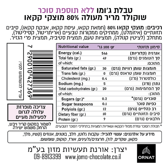 אלרגנים: עלול להכיל עקבות גלוטן, חלב, בוטנים, סויה, אגוזים (קשיו, מלך, פקאן, שקדים, לוז), חרצנים/גלעינים, אורז, קוקוס, שומשום.