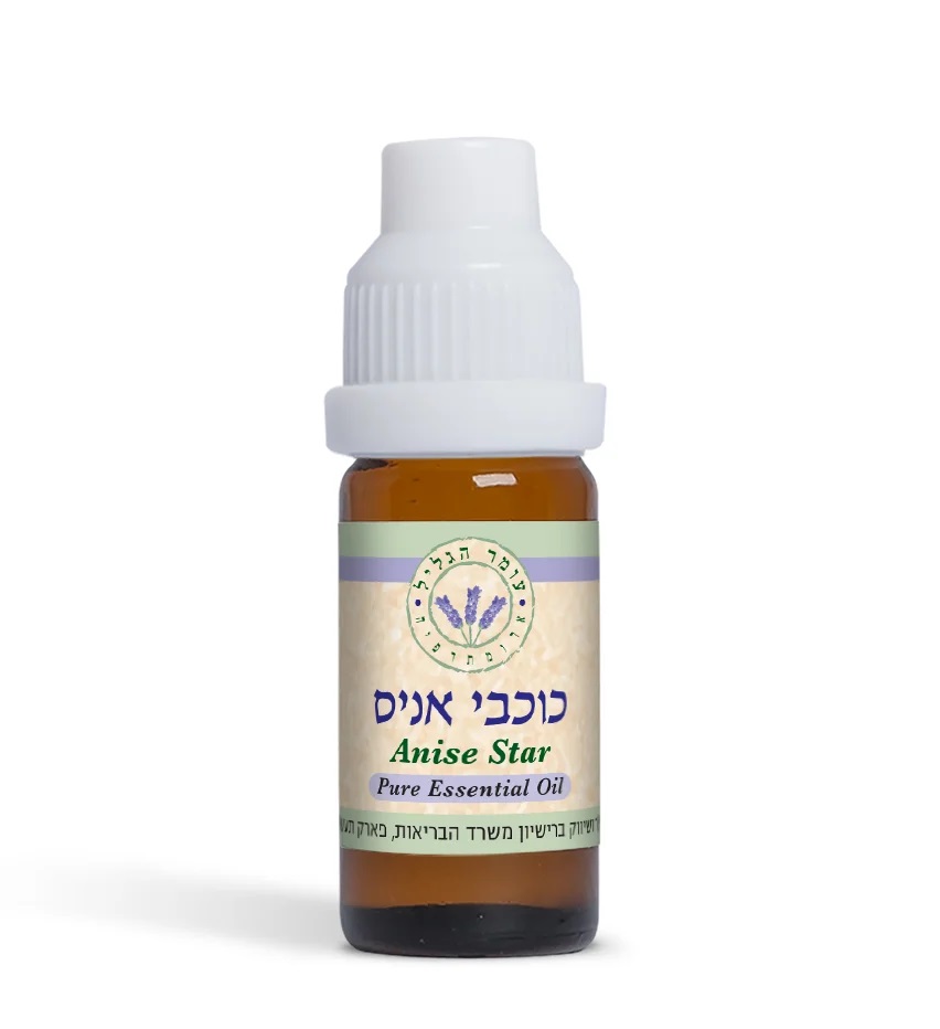 עומר הגליל - שמן אתרי כוכבי אניס טהור, מופק מפרי הכוכב אניס בשיטת זיקוק בקיטור מוקפדת. שמן ארומטי עם ניחוח מרגיע ומתוק, מסורתי ברפואה עתיקה, עם יתרונות לגוף ולנפש, כולל תמיכה בעיכול והפחתת מתח.